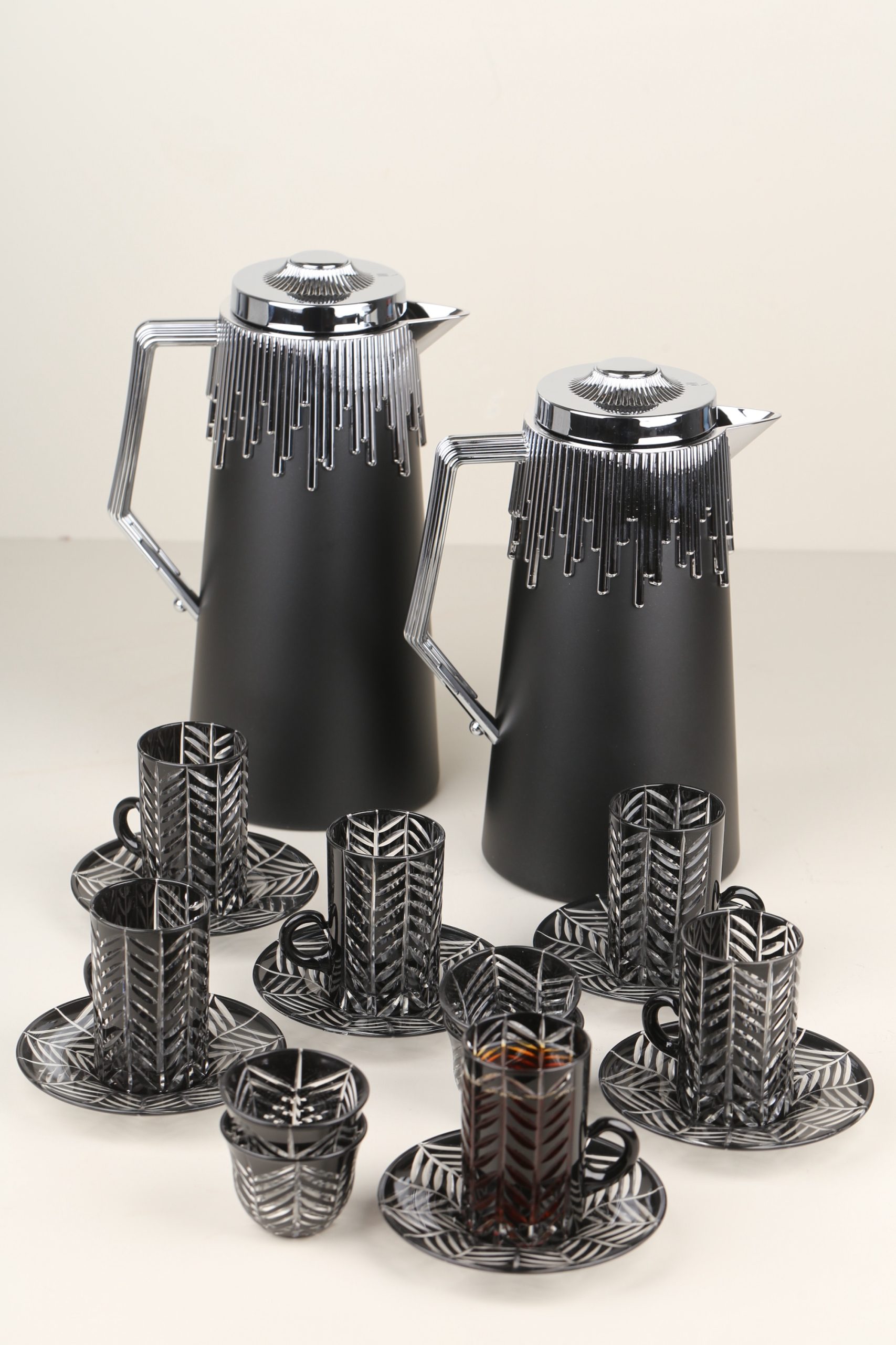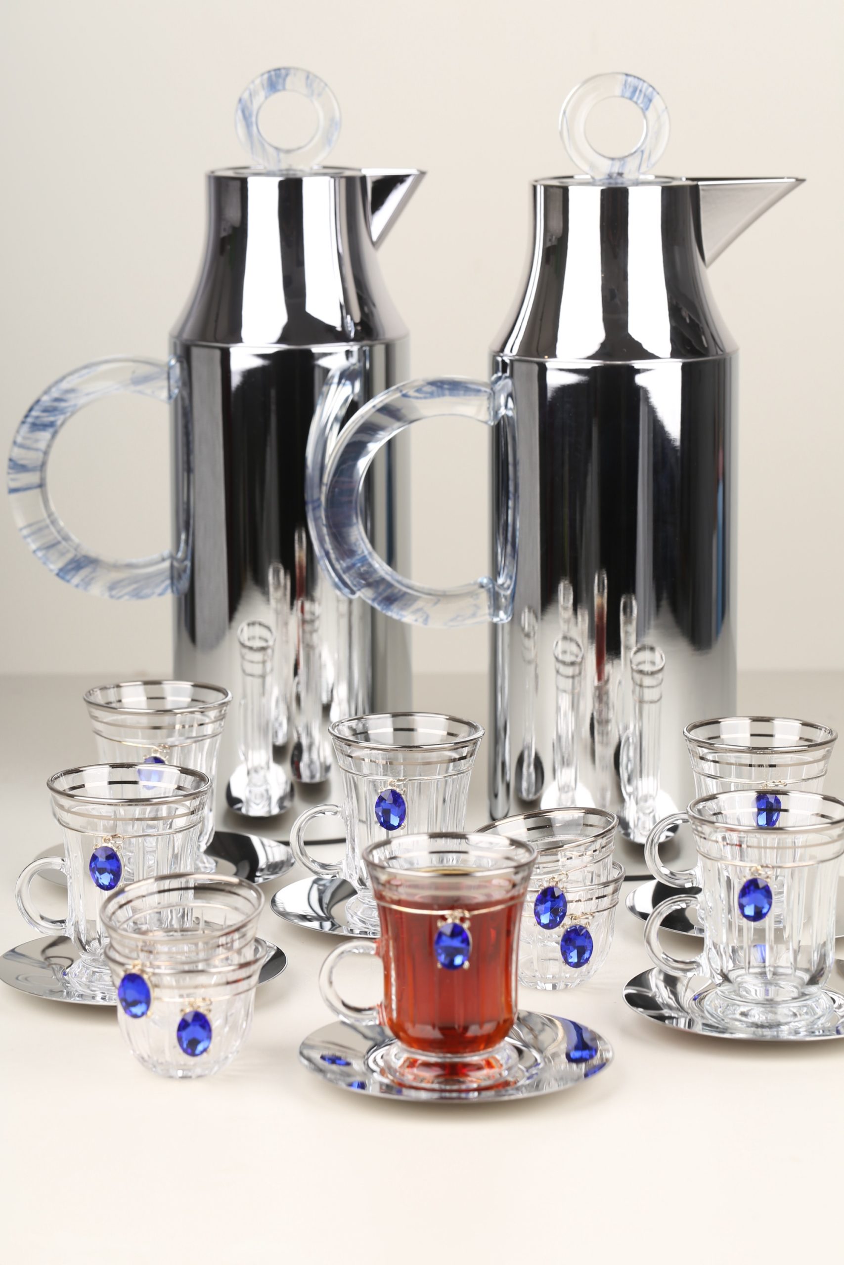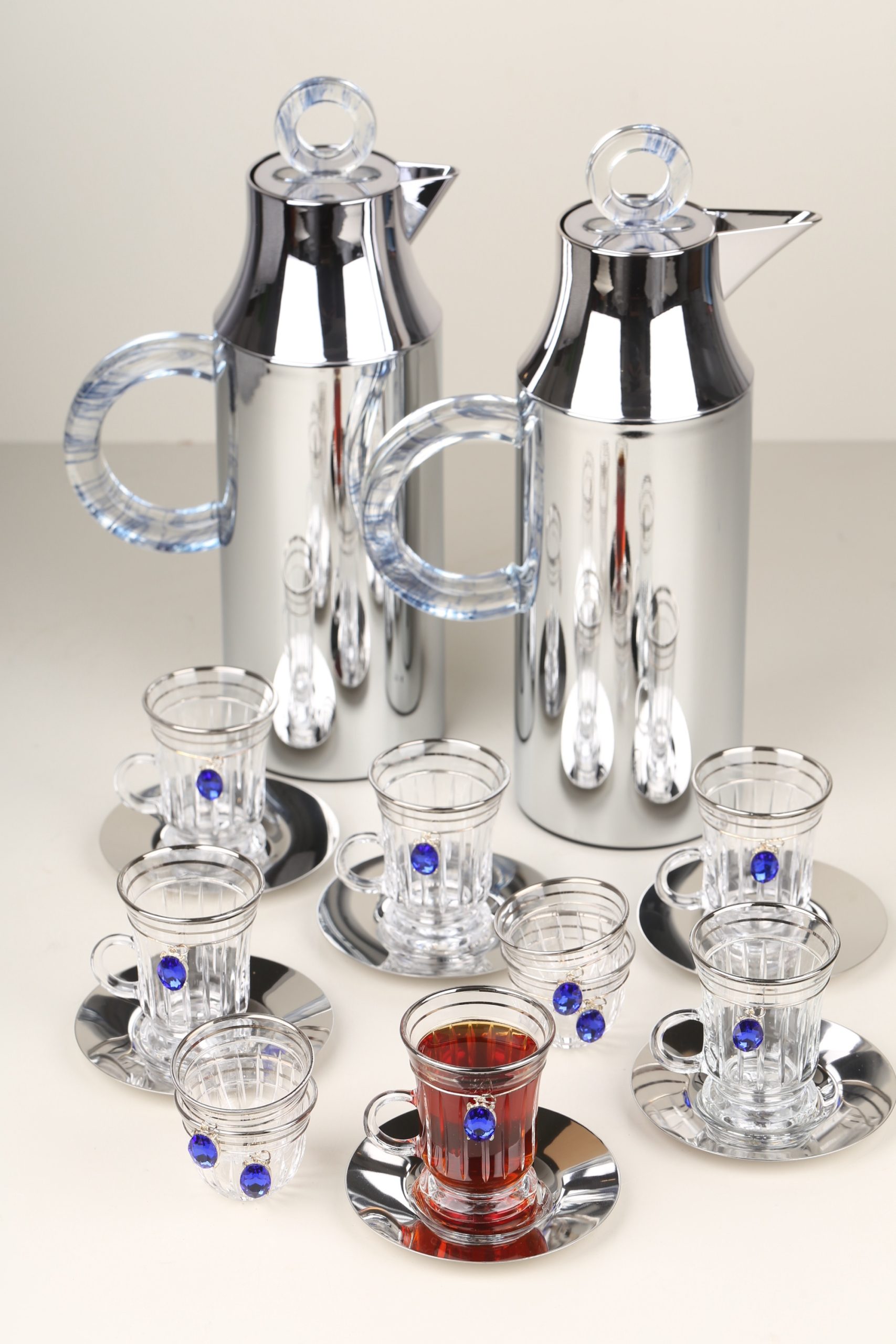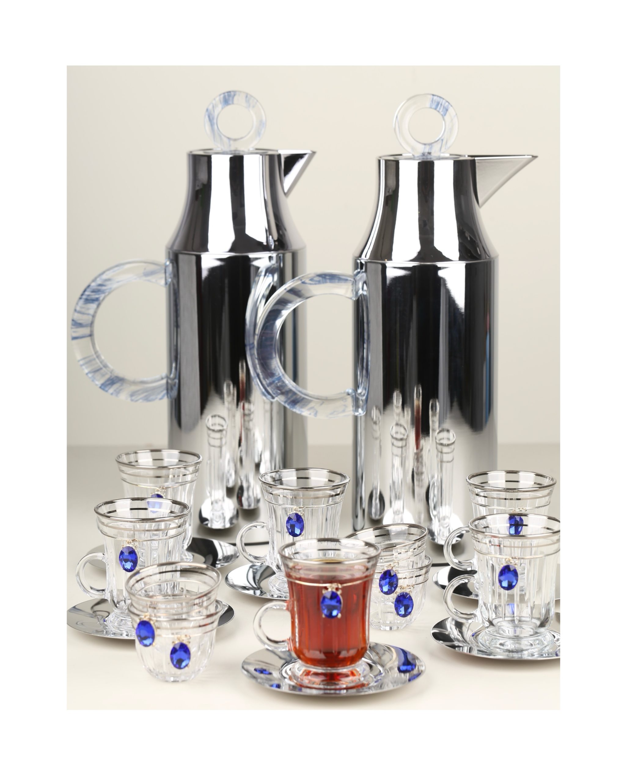 طقم مطارتين قهوة و شاي باللون السيلفر مع صينية أكريليك •