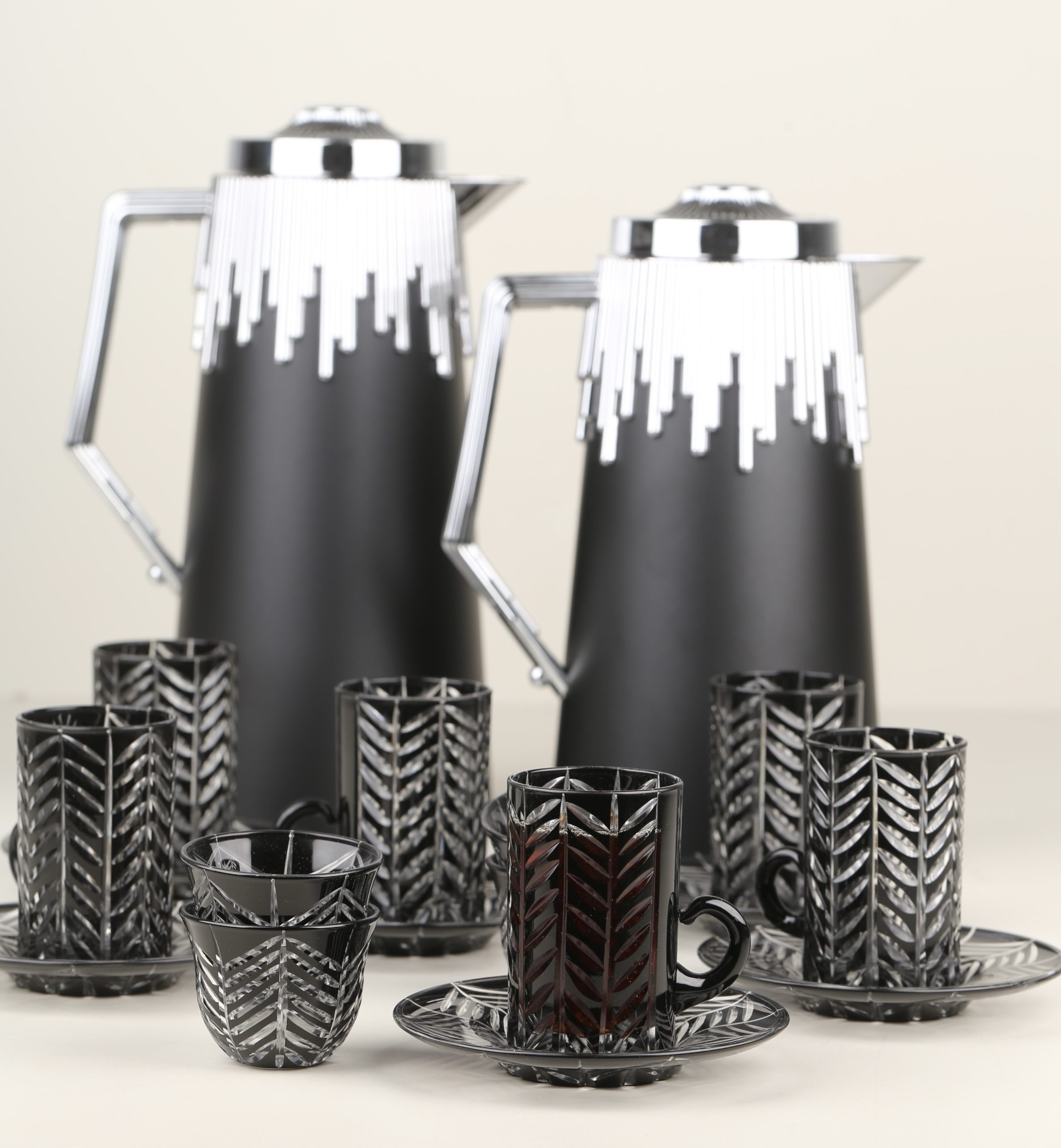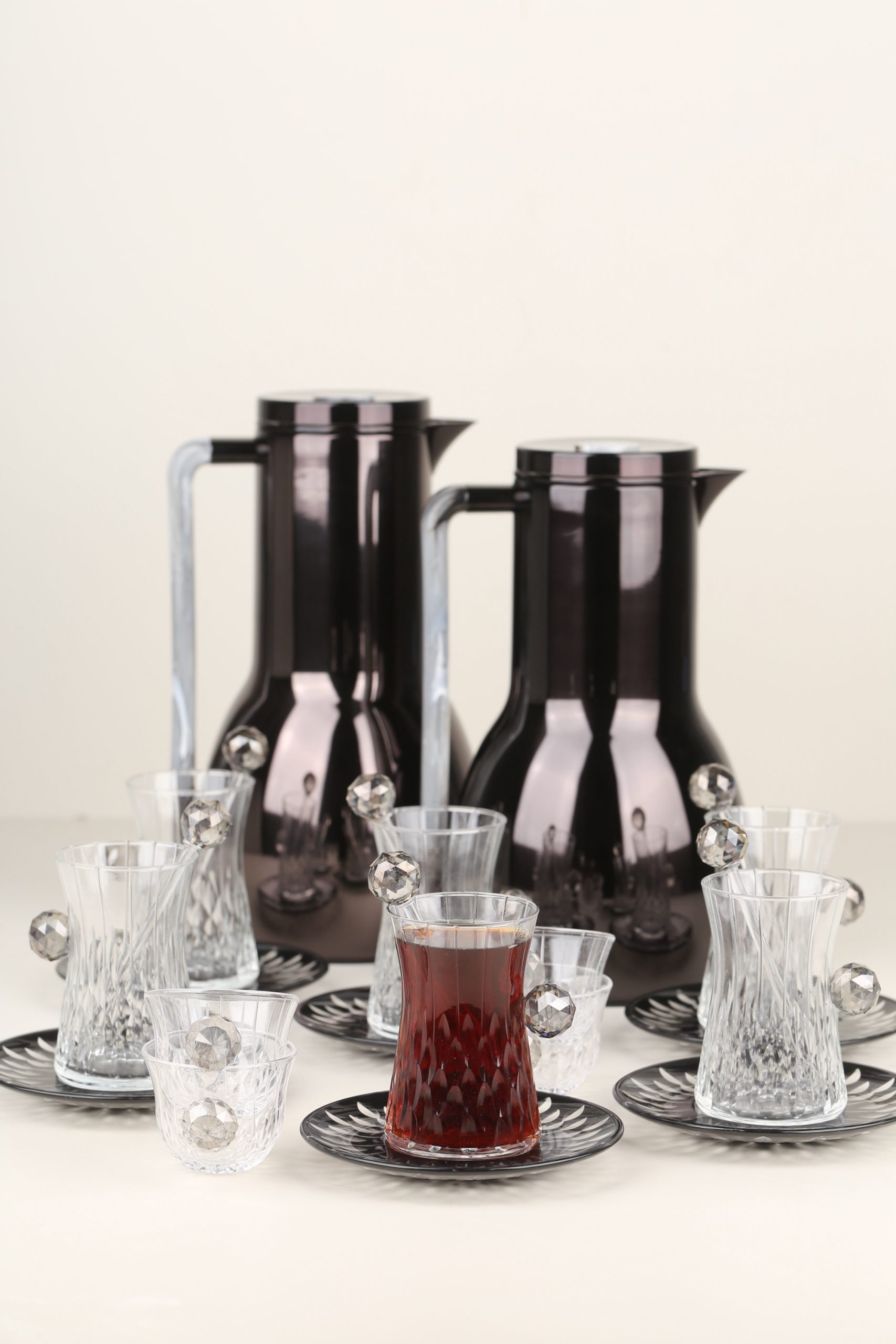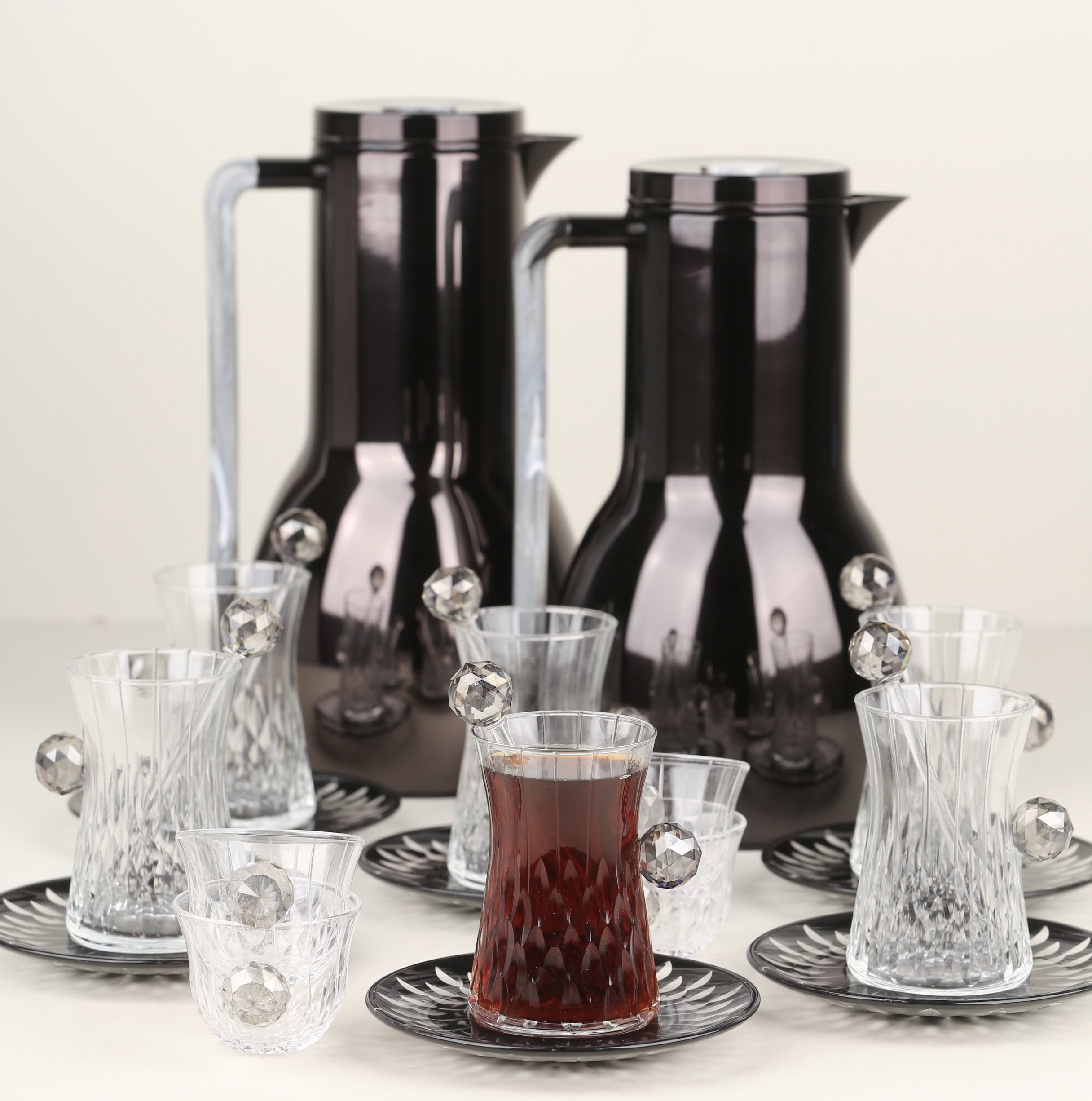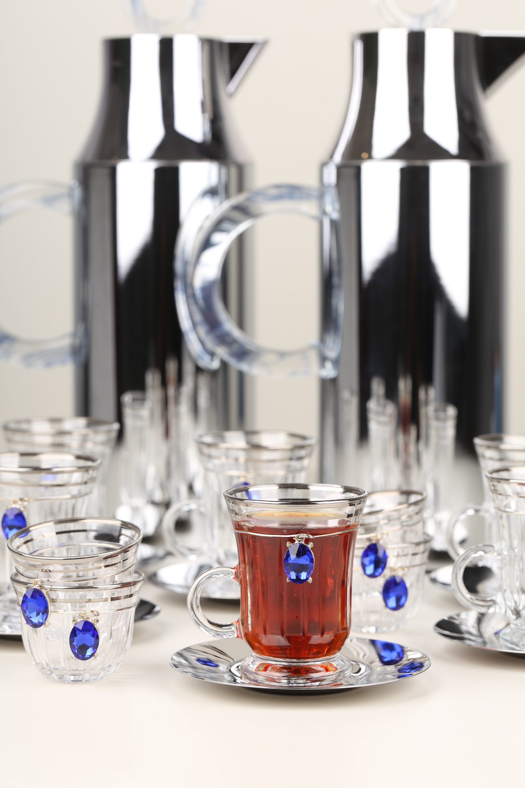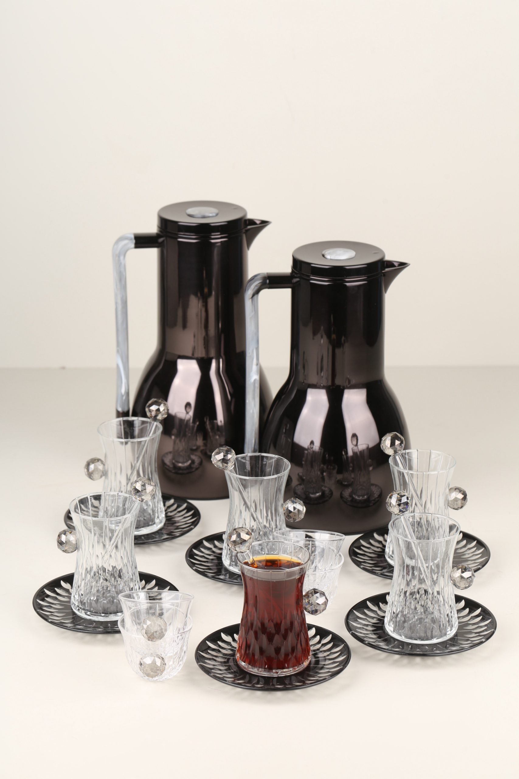 طقم مطارتين قهوة و شاي باللون السيلفر مع صينية أكريليك •