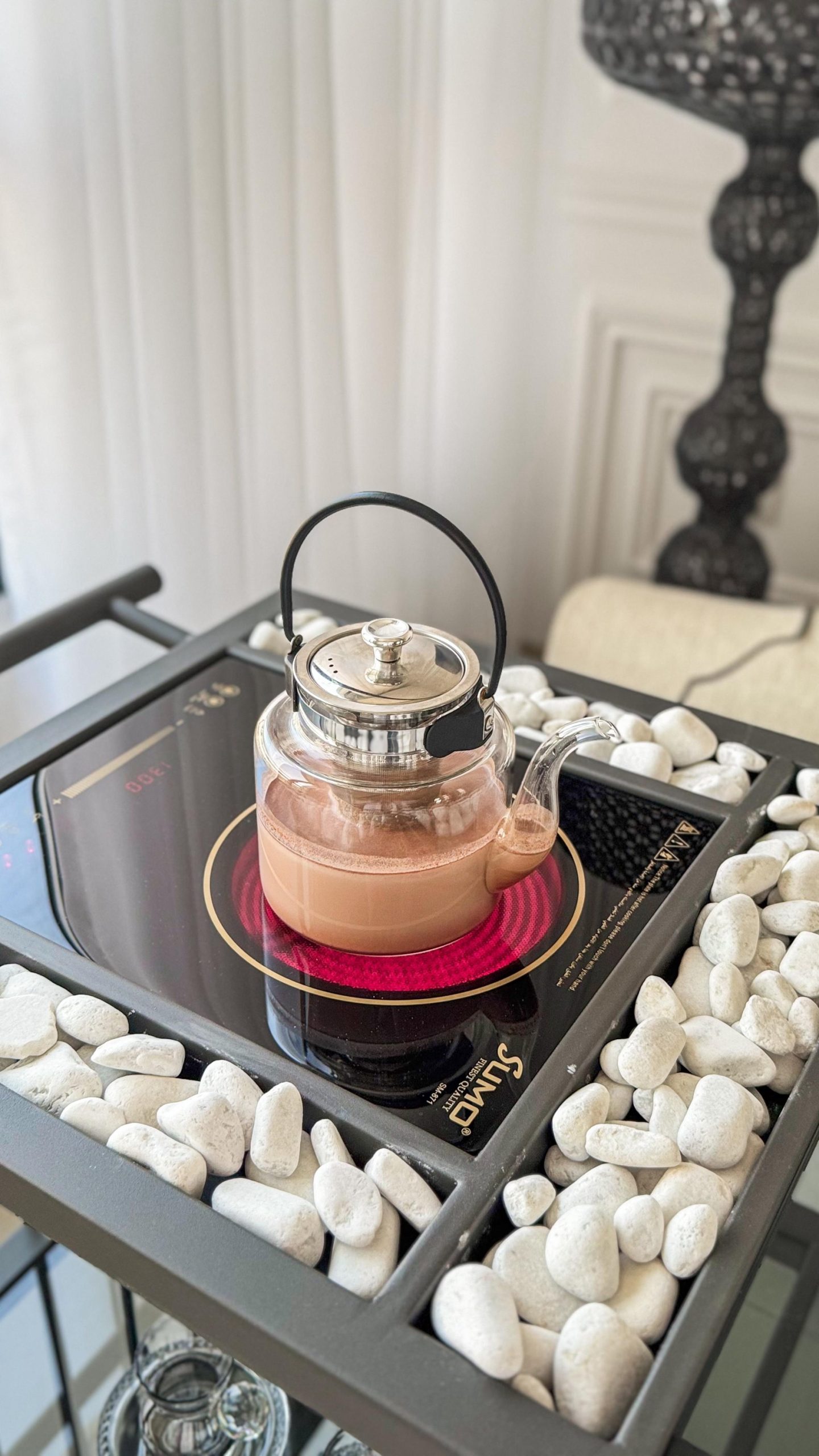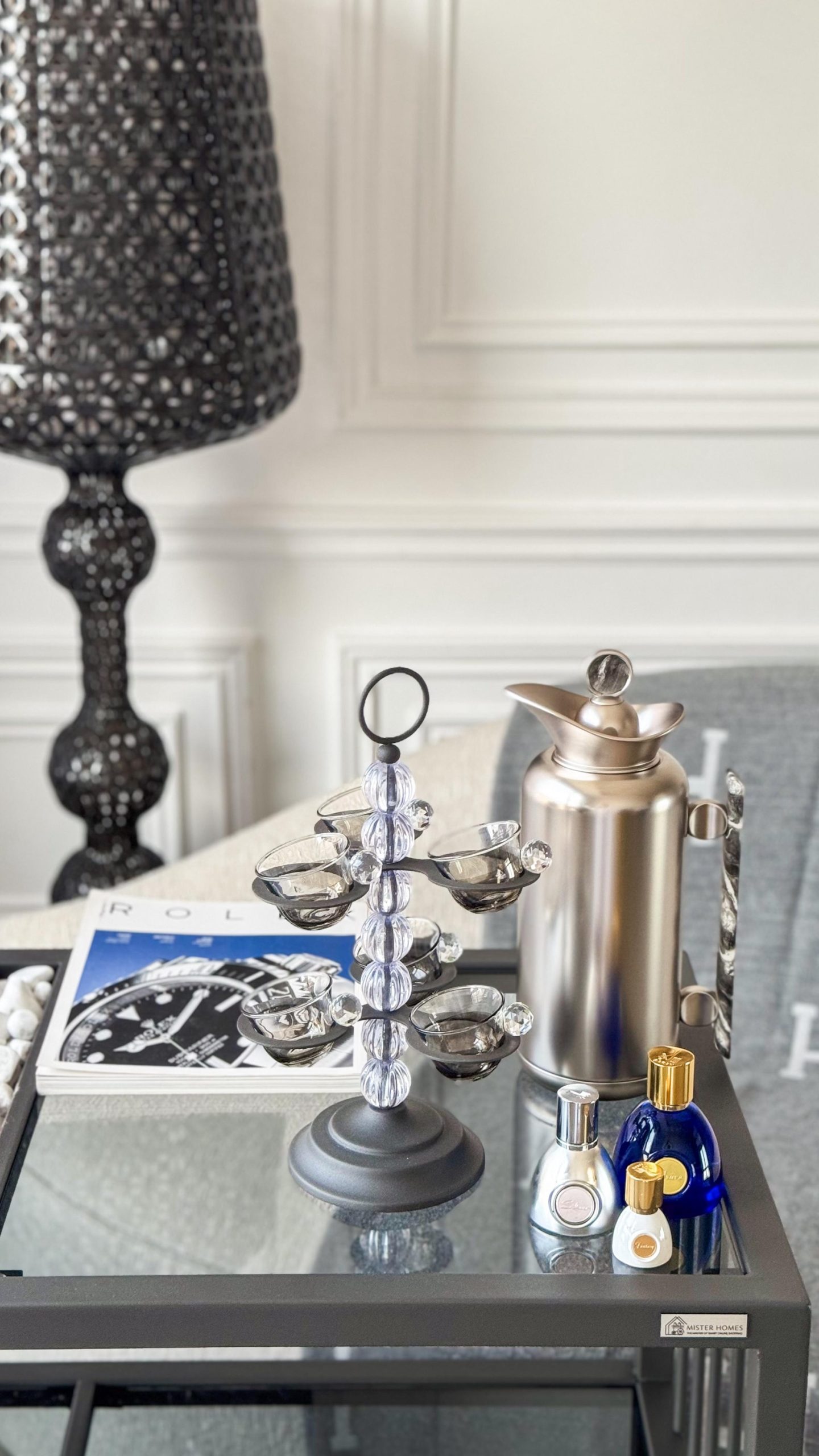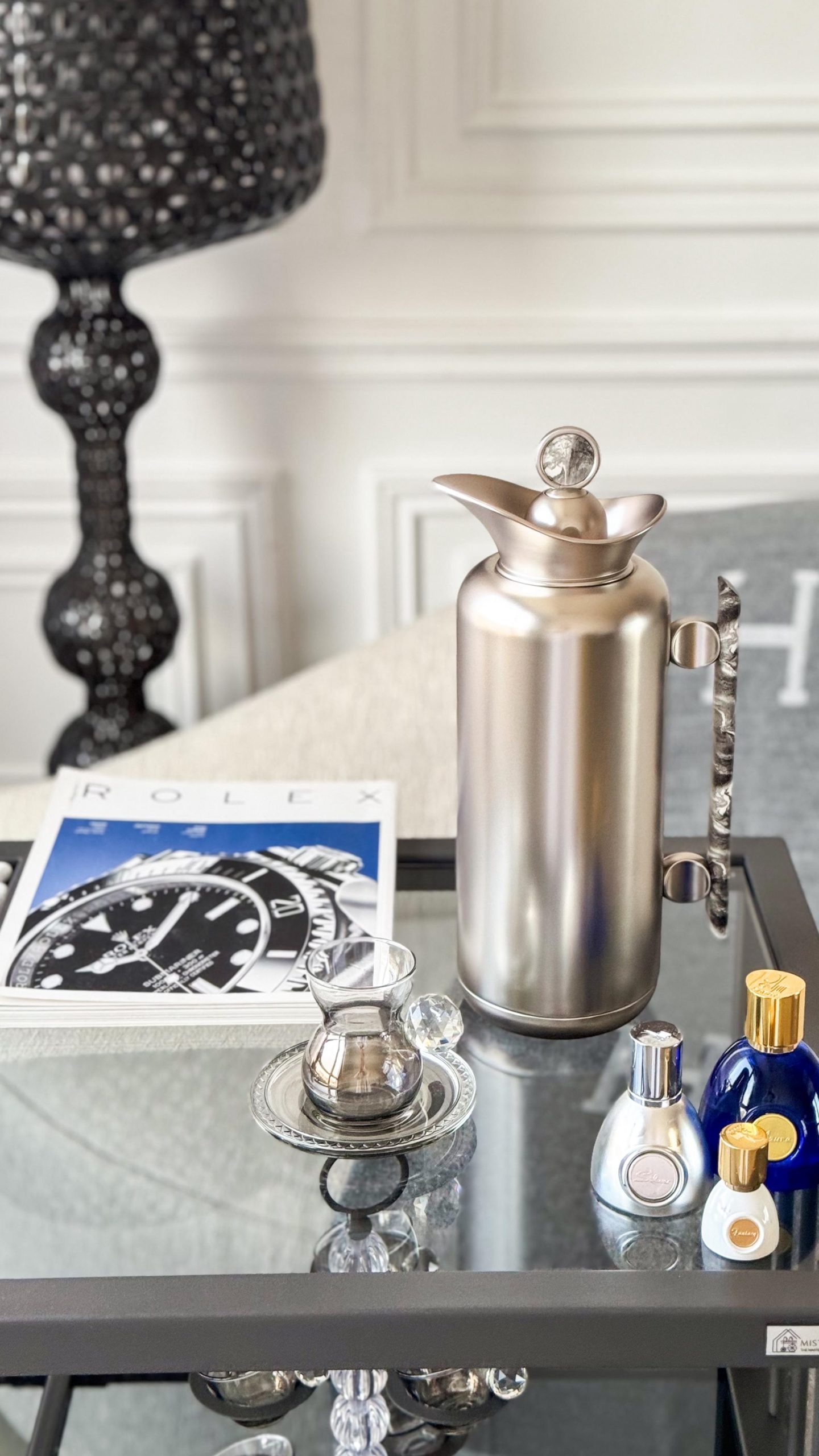 6 استكانات مع مكان مخصص للنعناع باليدة , 6 فناجيل قهوة عربية ، 6 صحون استكانات بتصميم الوردة