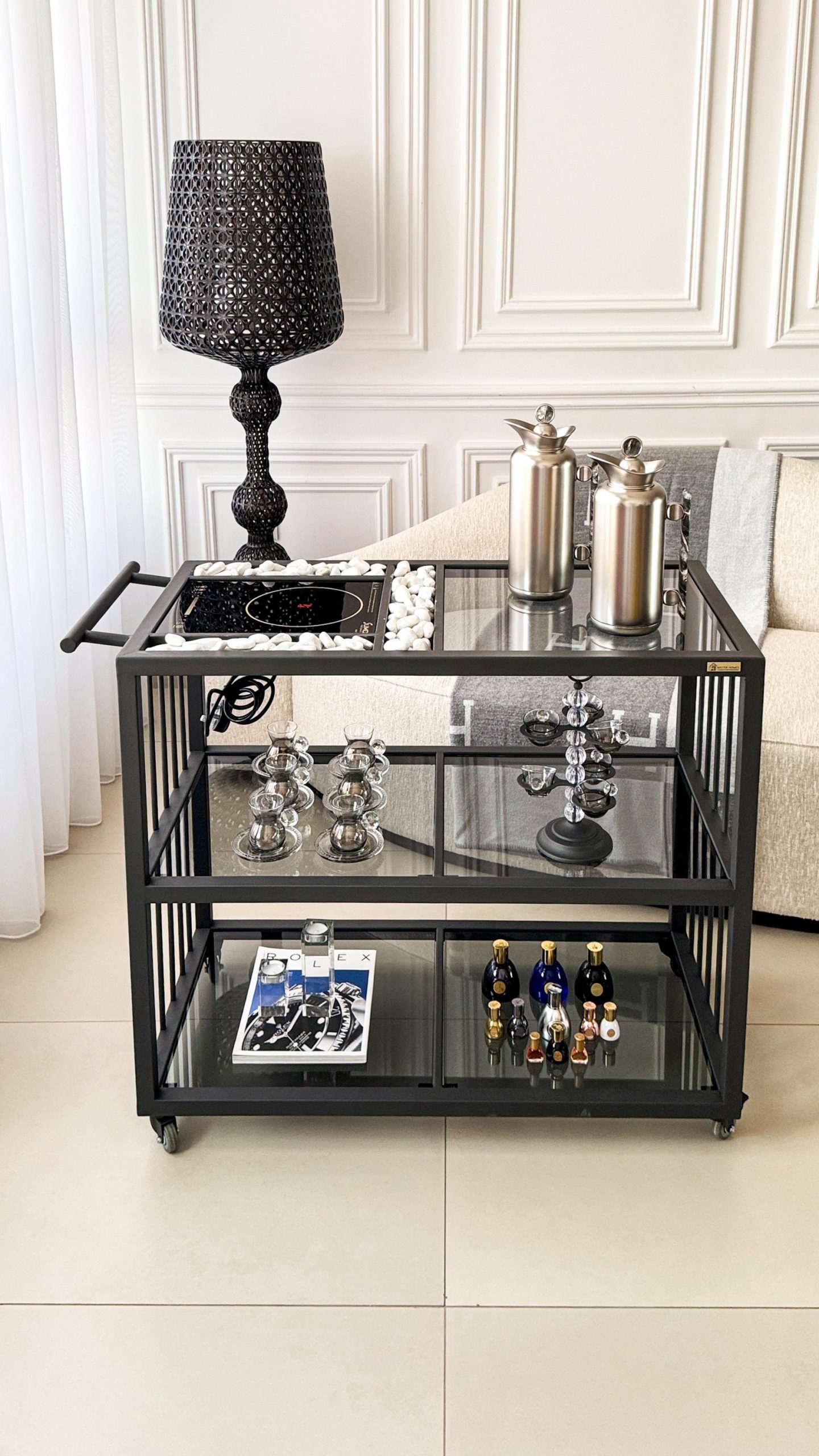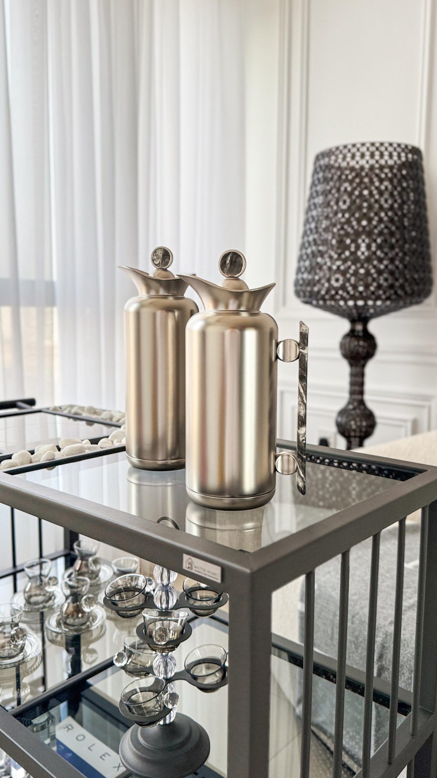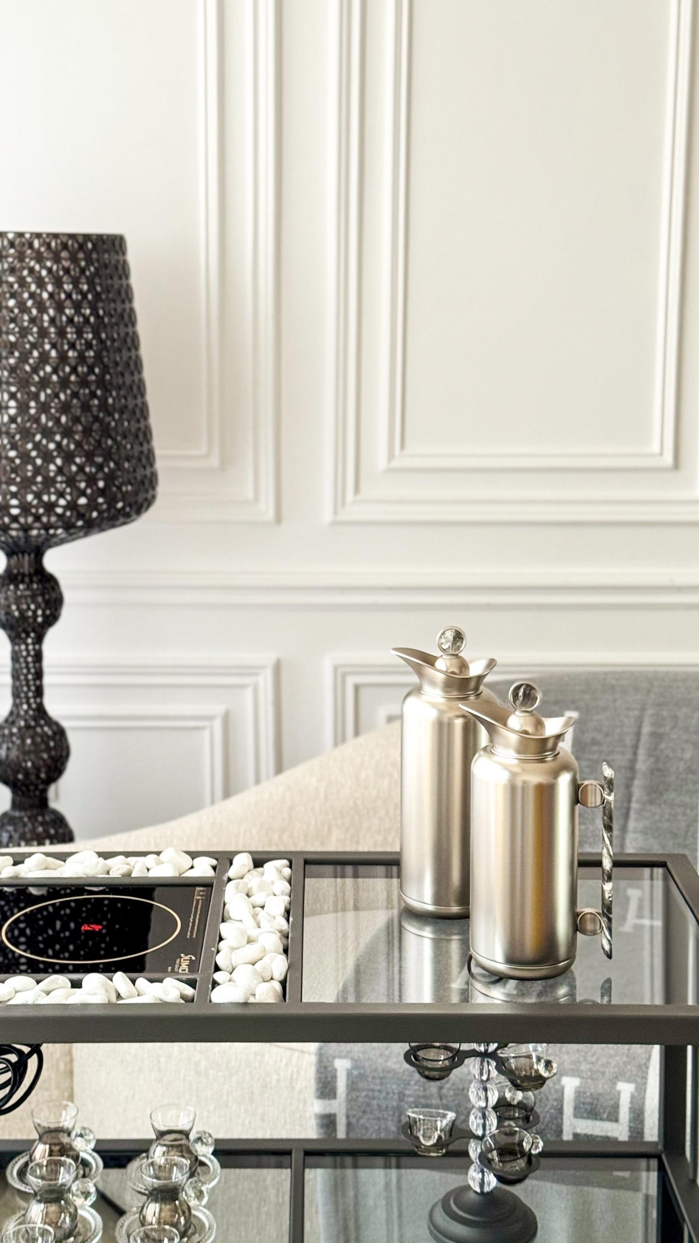 6 استكانات مع مكان مخصص للنعناع باليدة , 6 فناجيل قهوة عربية ، 6 صحون استكانات بتصميم الوردة