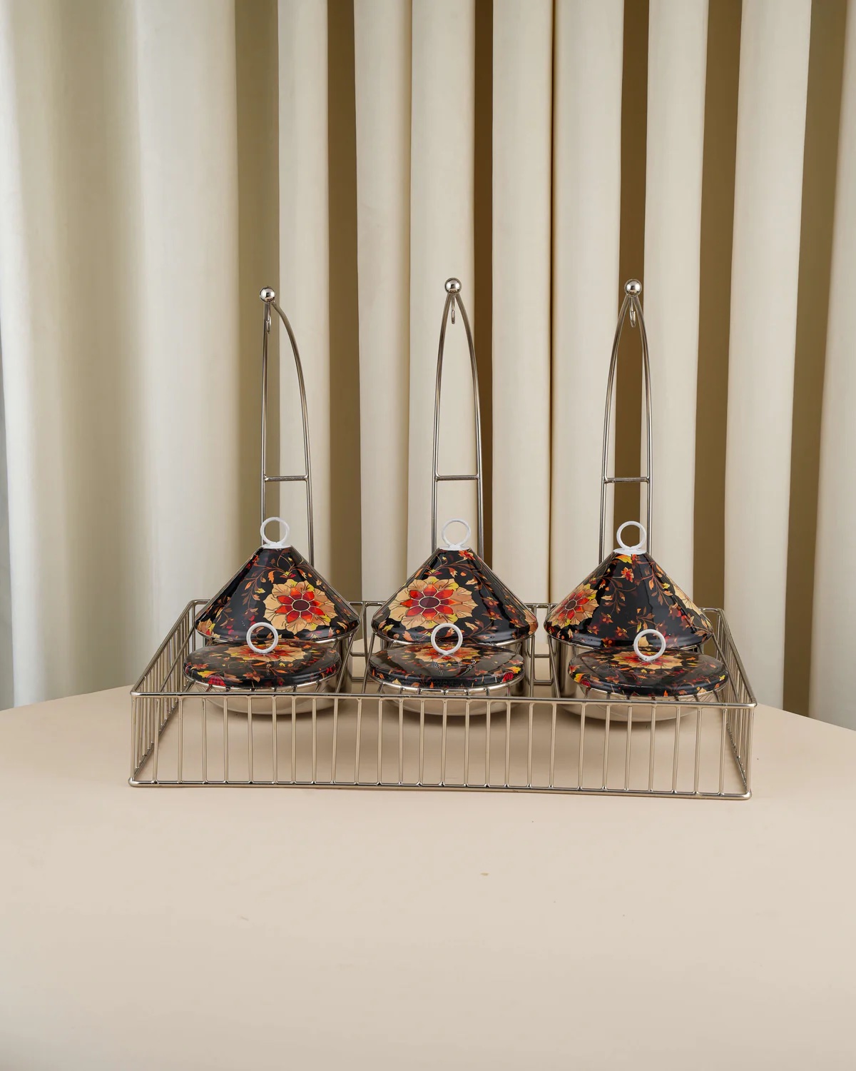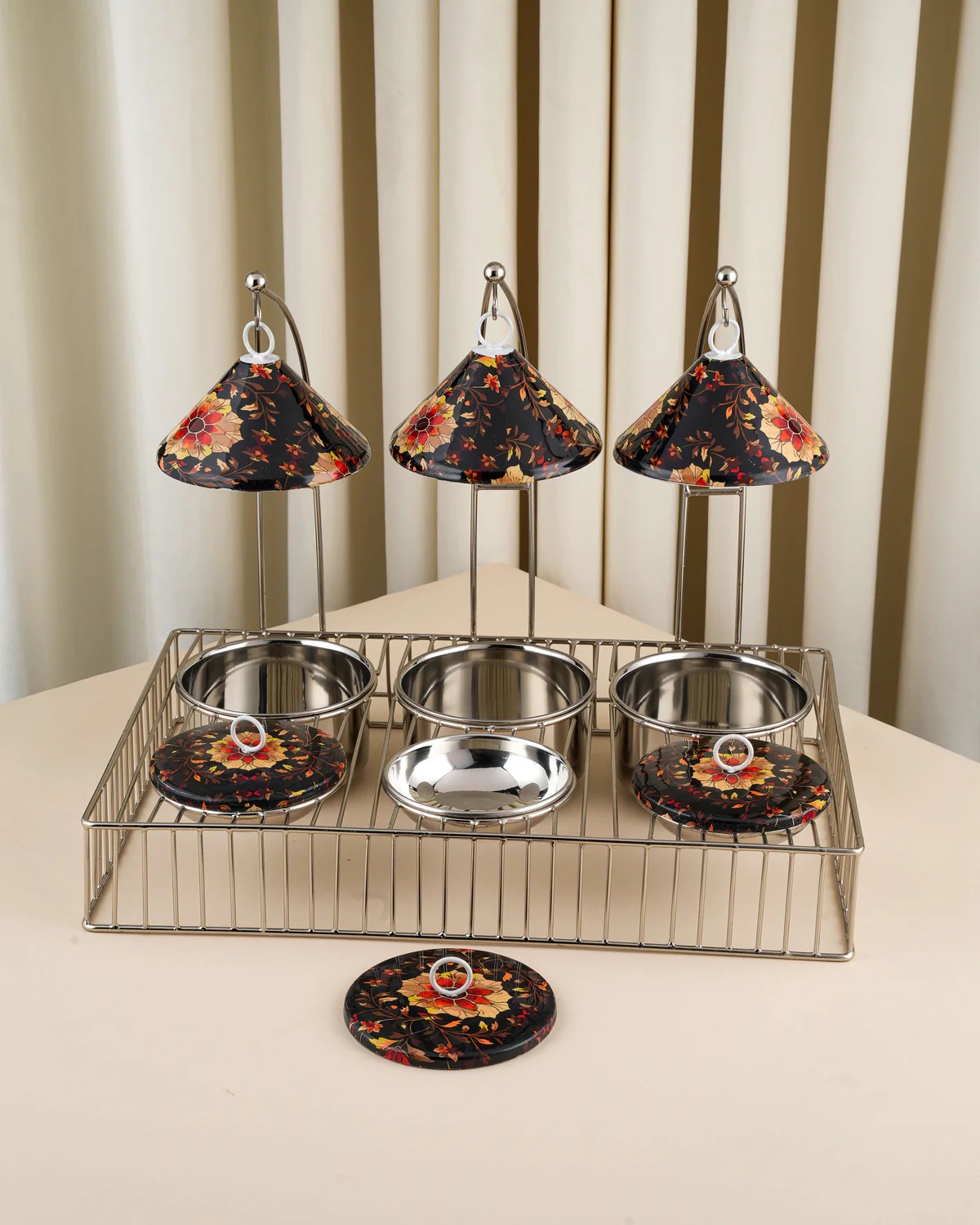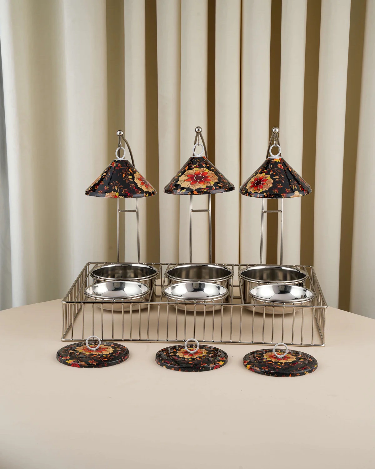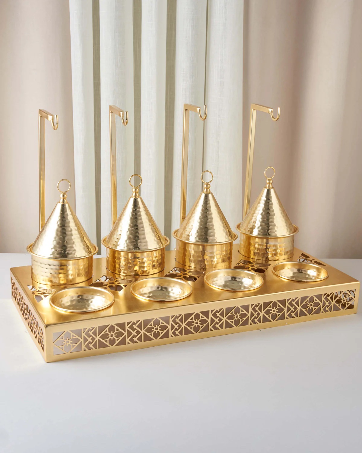 يتكوّن من أربع مواعين للحمسات مزوّدة بأغطية وأربع مواعين للنواشف لتقديم متنوع ومرتب.