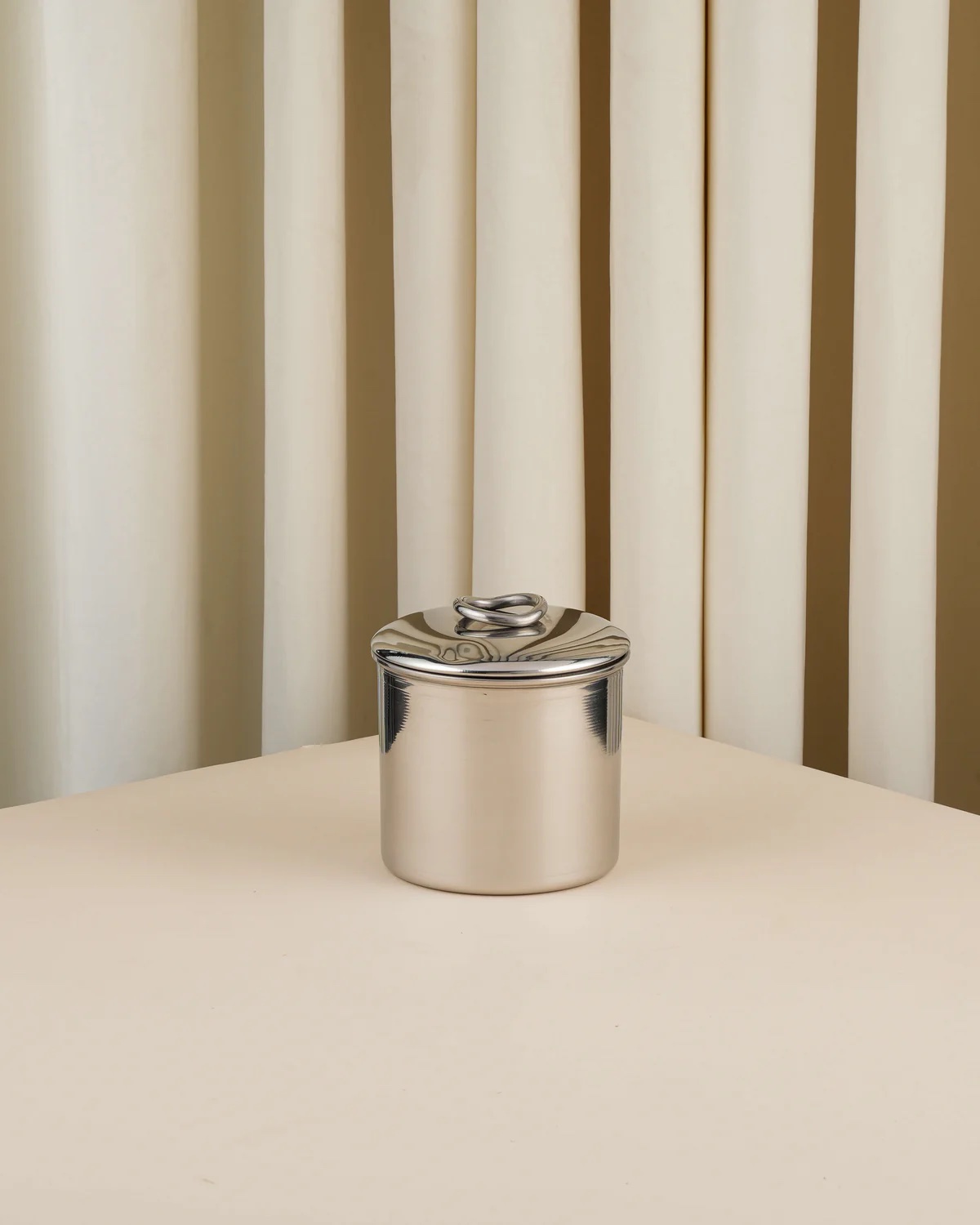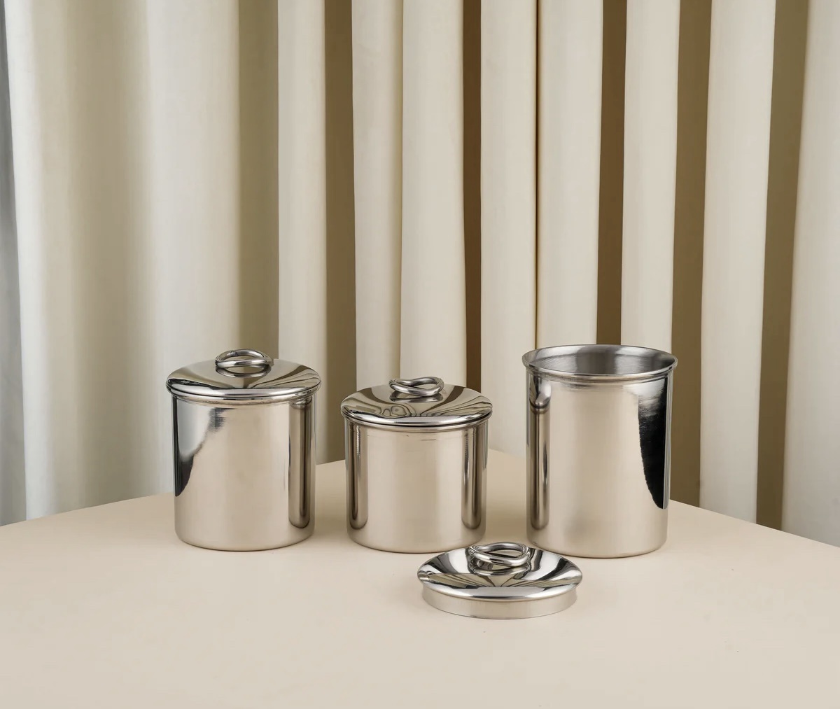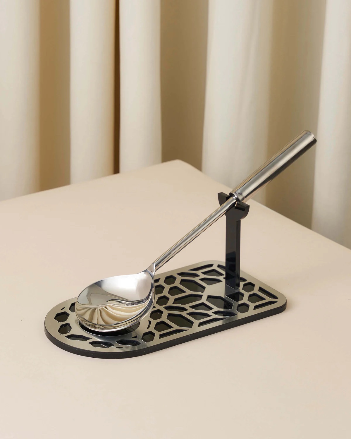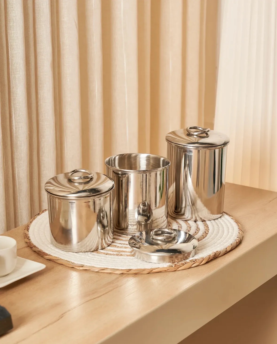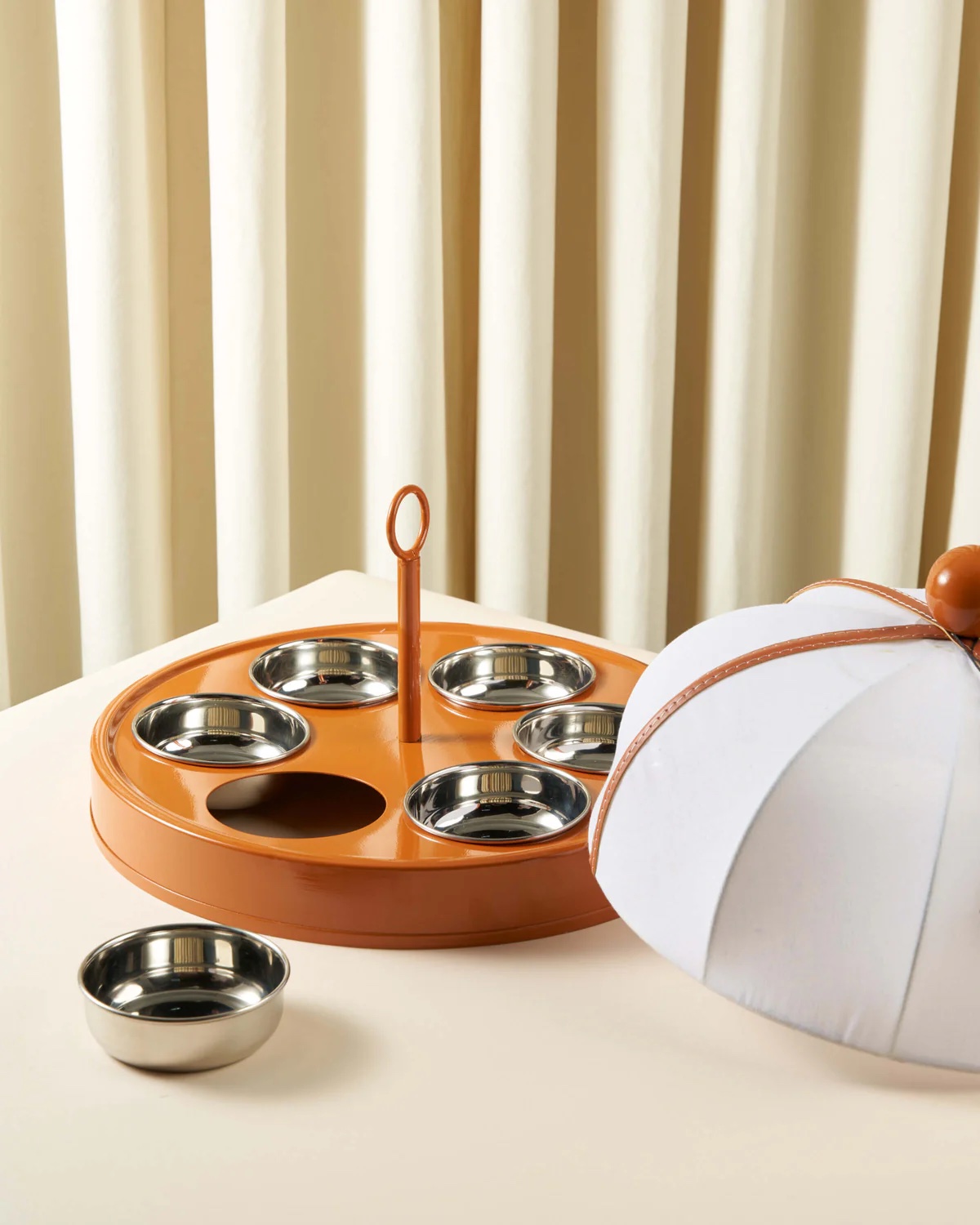 يأتي بغطاء خام مزوّد بلمسة جلدية فاخرة مع 6 صحون ستيل أنيقة وقاعدة معدنية متينة تجمع بين الفخامة والعملية.