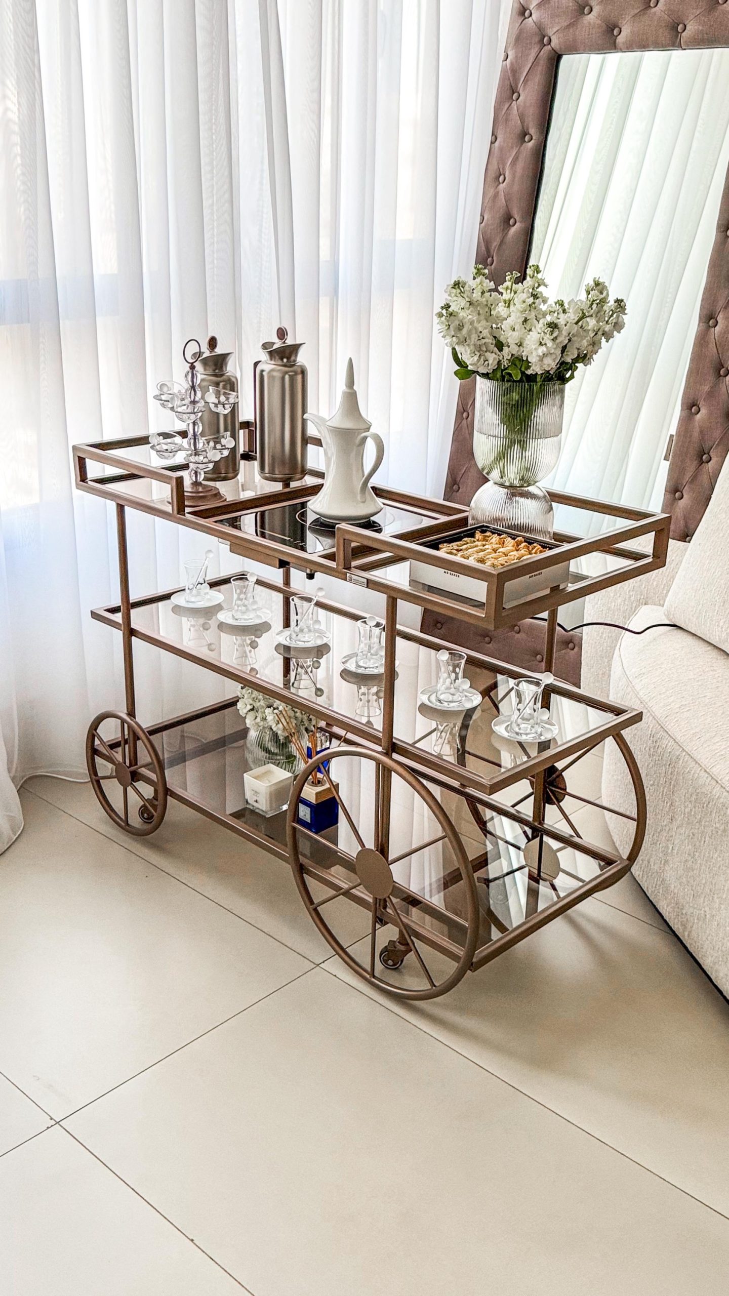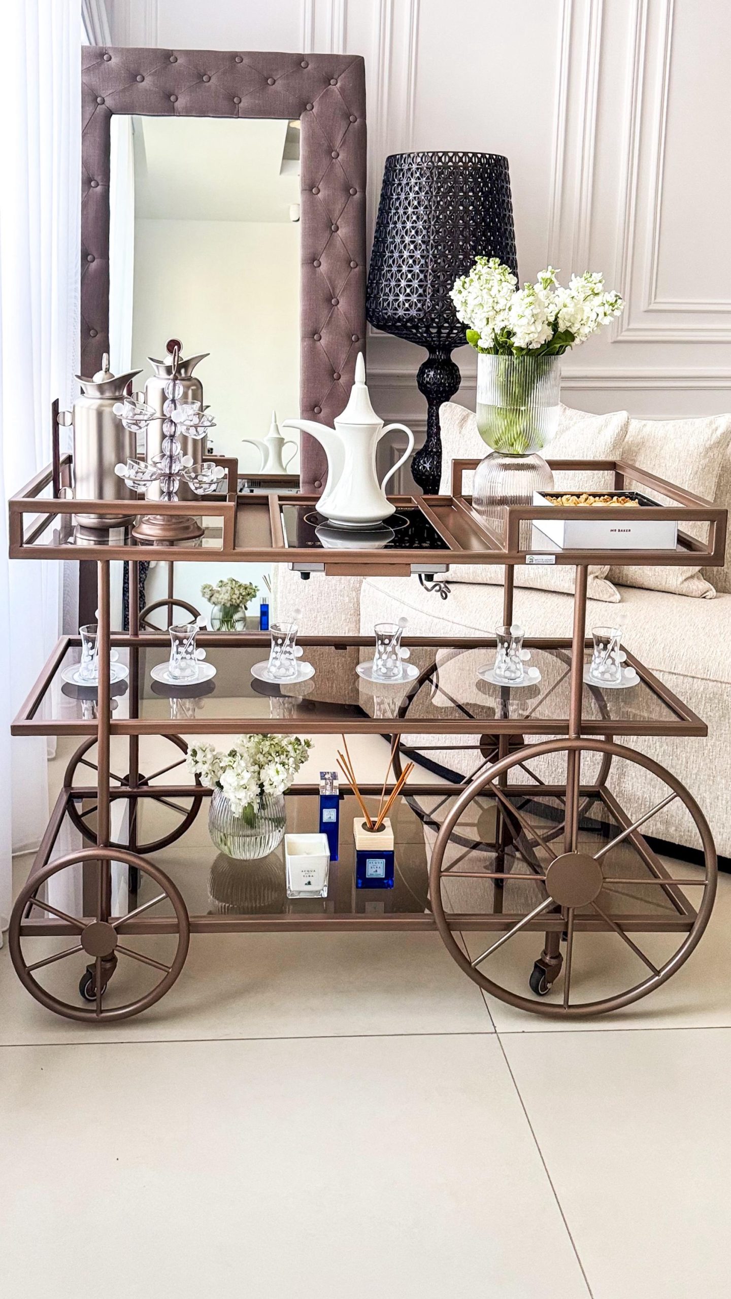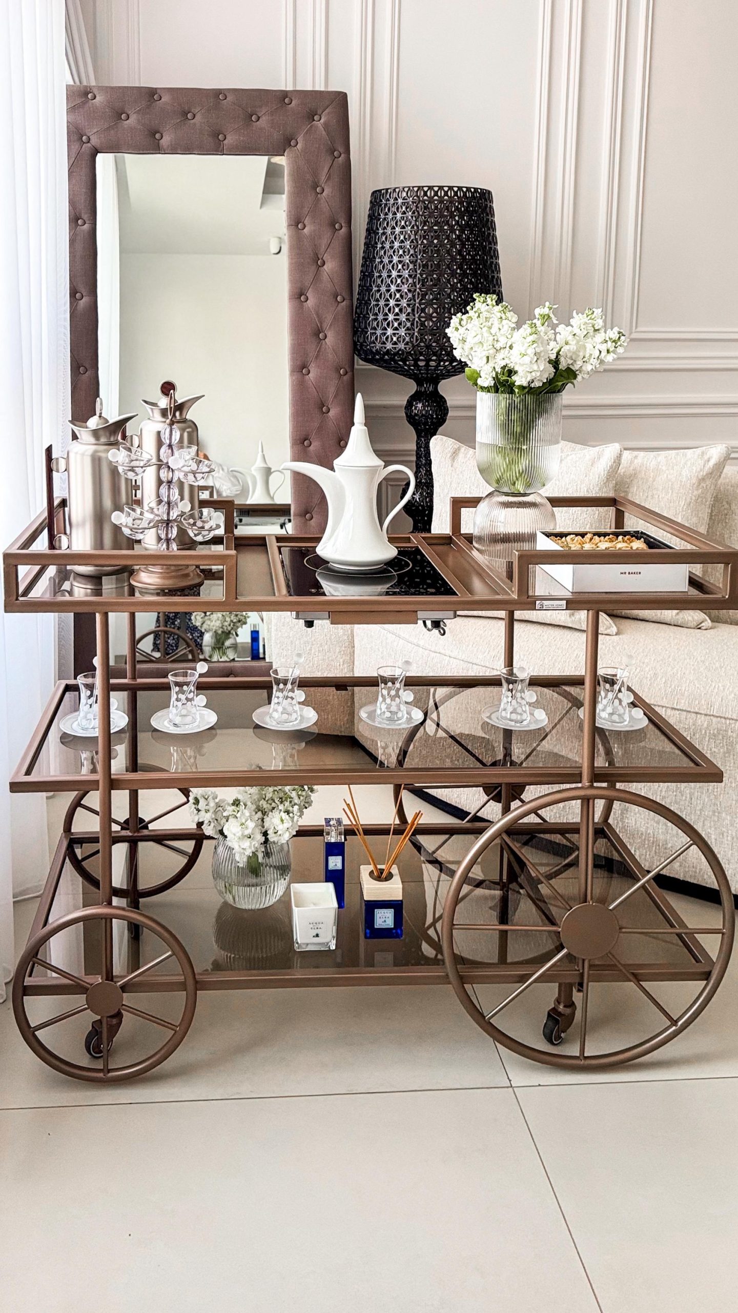 ترولي مستر هومز الجديدة لضيافتكم الراقية ، مع دوة الكهربا و أحجار بيضاء للزينة باللون المُميز رمادي مطفي ✨